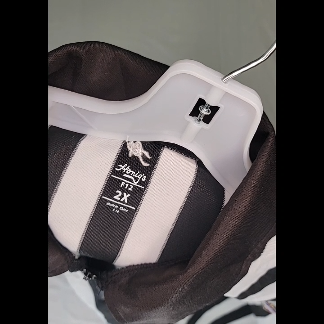 Show your support for the game with this Vintage Honig's Striped Referee Shirt. This stylish and versatile shirt features bold black and white vertical stripes, providing a classic and recognizable look. Perfect for any sports fan or referee, this 2X size shirt is made from an unknown material for comfort and durability. The shirt also features a zip-up front and a prominent Honig's logo for added branding. This excellent condition referee shirt is a must-have for any sports enthusiast.