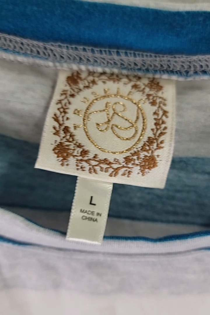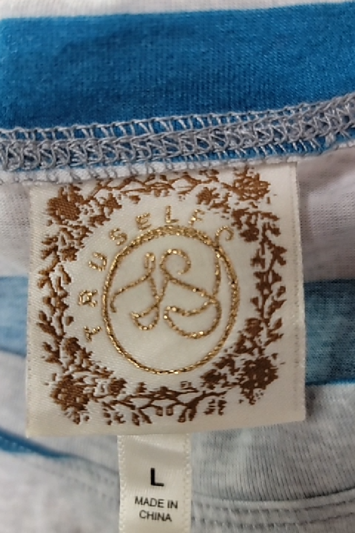 Show off your casual style with this adorable Russel striped top. The long sleeves and twisted knot front add a touch of trendy flair. Featuring a flattering and comfy fit in a classic teal, gray, and white stripe pattern. This lightweight, stretchy long-sleeve top is perfect for everyday wear, and is sized large. Crafted from a soft, breathable blend of 85% polyester and 15% spandex, this top is comfortable all day long. Machine wash cold and tumble dry low for easy care. Order yours today!