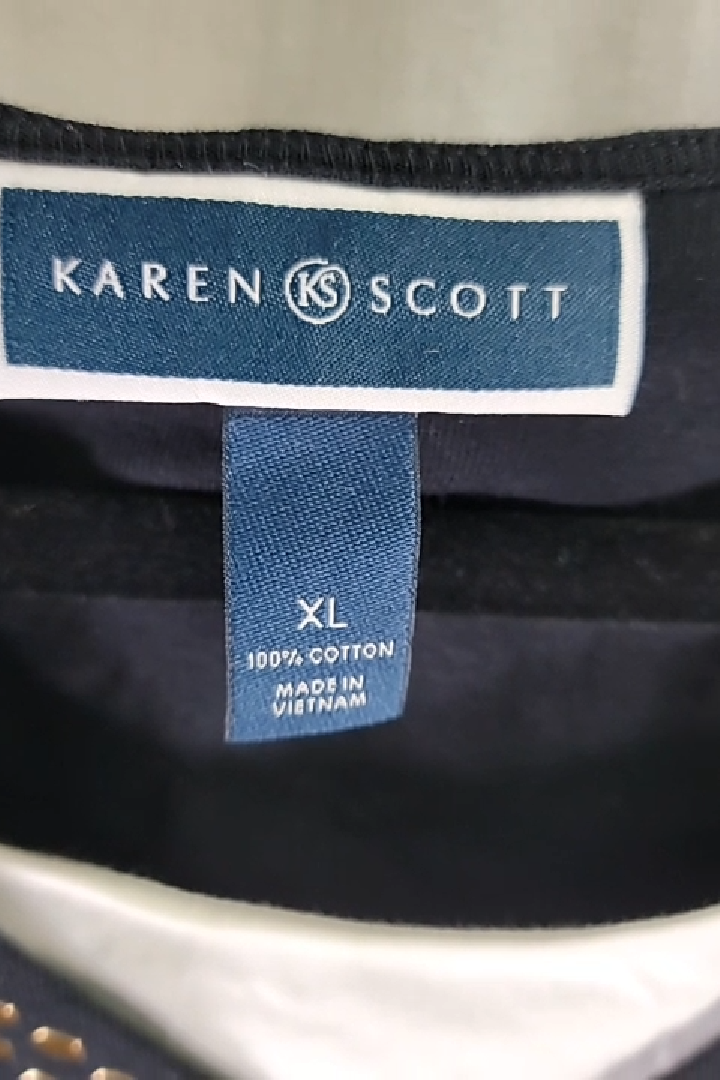 Elevate your casual style with this exquisite Karen Scott black beaded top. Featuring a captivating v-neck adorned with shimmering gold-tone beads, this top adds a touch of glamorous sophistication. The comfortable 100% cotton material ensures all-day wearability. Perfect for any occasion, whether it's a brunch with friends or a casual outing. This XL size black beaded top is made in Vietnam and is a versatile piece to add to your wardrobe. The exquisite design and comfortable fabric make it a must-have for your collection.