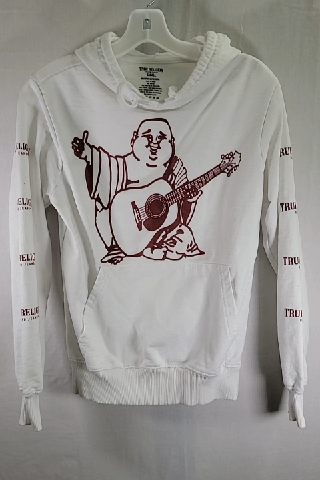 Show off your love for True Religion with this stylish white hoodie. Featuring a comfortable fit and a relaxed silhouette, this hoodie is perfect for everyday wear. The graphic print of a meditating Buddha playing a guitar adds a unique touch. The small size is ideal for a variety of body types, making it a versatile choice for any occasion. Machine wash cold for easy care. This stylish piece is perfect for casual outings or a comfy weekend.